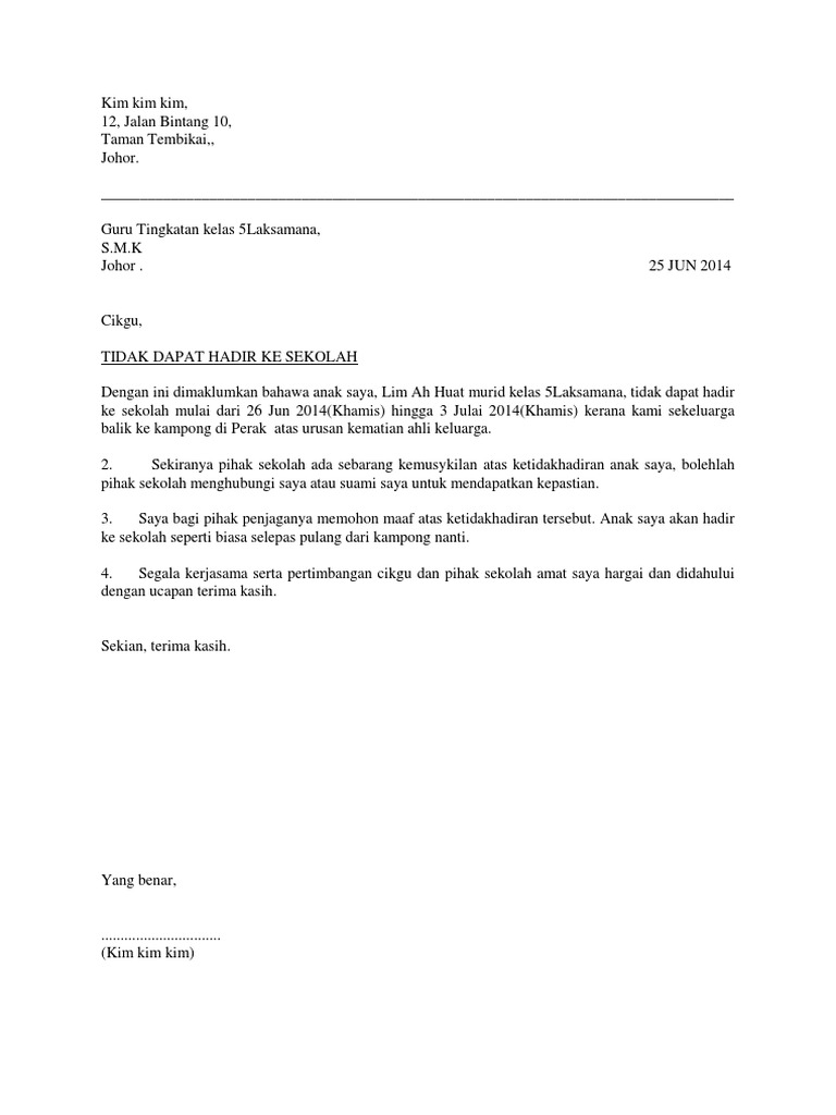70, jalan mega jaya 1 anak saya tidak dapat hadir ke sekolah pada tarikh berkenaan kerana perlu bersama keluarga menghadiri majlis perkahwinan abangnya di johor/ada pembacaan wasiat keluarga/ada. .28 september 2016 tidak dapat mengikuti pelajaran seperti biasanya dikarenakan ada urusan hari rabu, 28 september 2016 tidak dapat hadir ke sekolah untuk mengikuti pelajaran seperti biasanya demikian surat izin ini saya buat. Jika anak anda tidak dapat menghadirkan diri ke sekolah atas alasan yang munasabah. Saya, penama seperti di atas ialah ibu kepada muhammad izzat amir b. Merujuk kepada perkara di atas. Pulang ke kampung kerana ada kematian sanak saudara. Saya harap hal ini menjadi maklum. Demikian surat ini kami perbuat, atas perhatian bapak/ibu guru, kami mengucapkan banyak terimakasih. Panduan lengkap 9 contoh tulis surat rasmi tidak hadir ke. Anak saya tidak dapat hadir ke sekolah pada tarikh berkenaan kerana beliau mengalami sakit perut/sakit kepala/demam yang membuatkan beliau tidak terdaya untuk meneruskan sesi persekolah pada hari tersebut, dengan itu. Operasi datang lewat ke sekolah via www.slideshare.net. Koleksi contoh surat tidak hadir ke sekolah atas pelbagai alasan. Kandungan surat kandungan surat mestilah mempunyai.